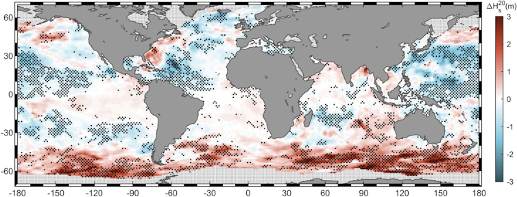 En paralelo, el calentamiento global puede ocasionar también cambios en los patrones e intensidad de los temporales, pero los aumentos medidos varían drásticamente en los diferentes mares y océanos. En algunas regiones, se ha producido incluso una disminución.