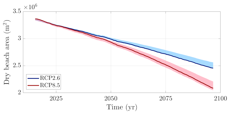 Cálculos posteriores con estos modelos a 2100 proyectan retrocesos de la línea de costa desde decenas de metros hasta un centenar de metros, dependiendo del tipo de playa y del escenario de cambio climático. Aunque las playas naturales tienen capacidad para adaptarse a un nivel del mar más alto migrando hacia tierra, un porcentaje elevado de ellas están urbanizadas y pueden desaparecer si no se aplican medidas de mitigación.
